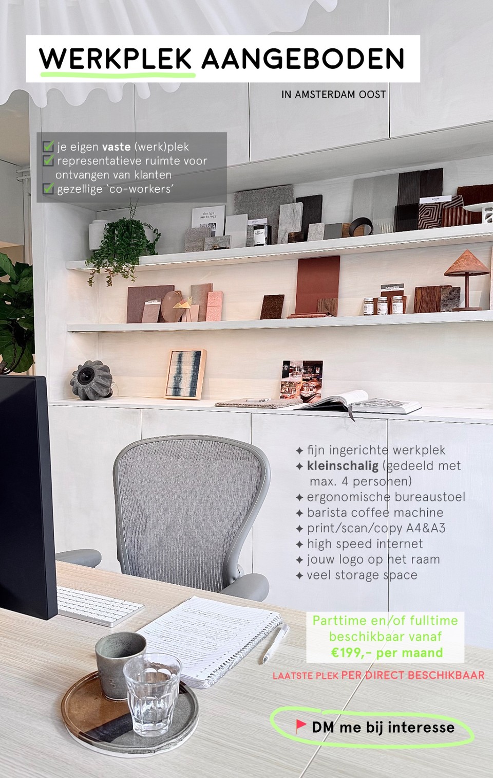 𝗘𝗲𝗻 𝗻𝗶𝗲𝘂𝘄 𝗷𝗮𝗮𝗿, 𝗲𝗲𝗻 𝗻𝗶𝗲𝘂𝘄𝗲 𝘄𝗲𝗿𝗸𝗽𝗹𝗲𝗸? (Laatste plek – per direct beschikbaar!) In onze fijne, kleinschalige studio in Amsterdam Oost is nog één vaste werkplek beschikbaar. Een rustige, representatieve ruimte die je deelt met maximaal 4 personen – ideaal voor zelfstandigen en creatieven die willen kunnen focussen en klanten willen ontvangen. De studio (50 m²) is afgelopen zomer volledig gerenoveerd. Daarnaast is er een extra kelderruimte van 50 m², ingericht als bibliotheek en werkplaats: perfect voor opslag of creatieve projecten. ✦ Beschikbaar: parttime (2–3 dagen) of fulltime (4–5 dagen) ✦ Huur: vanaf €199 per maand ✦ Locatie: Amsterdam Oost ✦ Contract: flexibel / voor onbepaalde tijd Interesse? Stuur me een bericht voor meer info of maak een afspraak voor een bezichtiging. ---------------------------------------------------------------------------- A new year, a new workspace? (Last spot available – ready to move in!) In our welcoming, small-scale studio in Amsterdam East, one fixed desk has become available. A calm and representative space shared with a maximum of four people — ideal for freelancers and creatives who value focus and want to welcome clients in a professional setting. The studio (50 m²) was fully renovated last summer. In addition, there is an extra 50 m² basement space, set up as a library and workshop — perfect for storage or creative projects. ✦ Availability: part-time (2–3 days per week) or full-time (4–5 days per week) ✦ Rent: from €199 per month (invoiced) ✦ Location: Amsterdam East ✦ Contract: flexible / open-ended Interested? Send me a message for more information or to schedule a viewing.